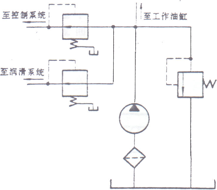 在定量泵液壓系統(tǒng)中,溢流閥按主系統(tǒng)的工作壓力進行調(diào)定,但控制系統(tǒng)需要的工作壓力較低,潤滑油路的工作壓力更低,這時可以采用如圖所示的減壓回路,減壓閥的出口壓力可以在比溢流閥所調(diào)定的壓力小的范圍內(nèi)調(diào)節(jié)。