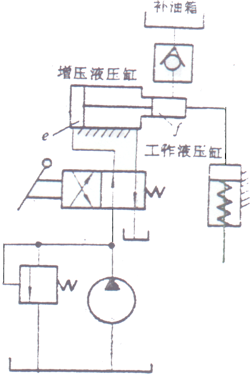圖中輔助油箱的主要作用在工作油缸活塞上升的時候,油液可以通過單向閥進入f缸,以補充這部分管路的泄漏(即增壓液壓缸的活塞左長移時)。