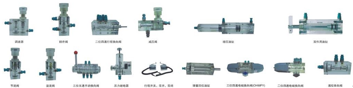 3、實(shí)訓(xùn)元件均為透明有機(jī)材料制成,便于了解掌握幾十種常用液壓元件的結(jié)構(gòu),性能及用途。掌握幾十種基本回路的工作原理,實(shí)驗(yàn)組裝回路快捷、方便。