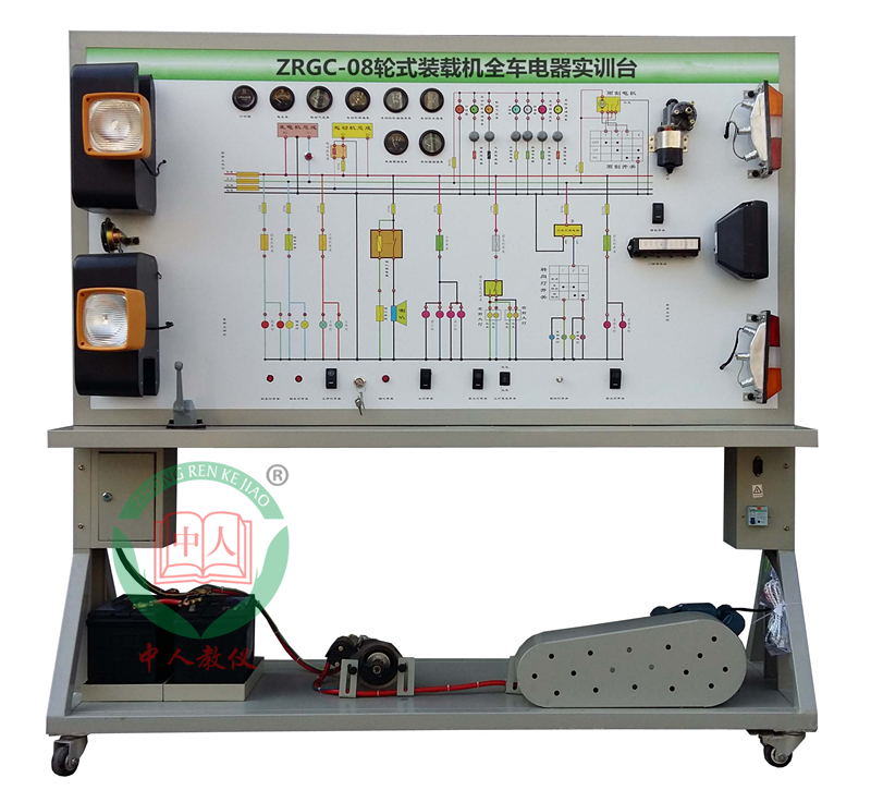 該設(shè)備采用ZC50輪式裝載機(jī)整車電器實(shí)物為基礎(chǔ),充分展示儀表系統(tǒng)、燈光系統(tǒng)、雨刮系統(tǒng)、喇叭系統(tǒng)、發(fā)動機(jī)電器系統(tǒng)、起動系統(tǒng)和充電系統(tǒng)等電器各系統(tǒng)的組成結(jié)構(gòu)和工作過程。