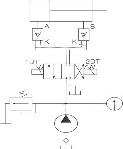 在圖示位置時,液壓泵輸出油液通過換向閥回油箱,系統(tǒng)無壓力,液控單向閥A、B關(guān)閉,液壓缸兩腔均不能回油,于是,活塞被雙向鎖緊。要使活塞向右運動,則需換向閥1DT通,左位接入系統(tǒng),壓力油經(jīng)單向閥A進行液壓缸左腔,同時也進入液控單向閥B的控制油口K,打開閥B,液壓缸右腔回油可經(jīng)閥B及換向閥回油箱,活塞便向右運動。反之向左,液控單向閥的密封性好,所以鎖緊效果較好。