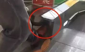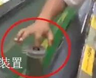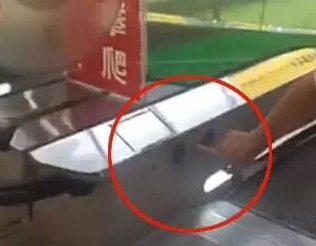 第二種,在自動扶梯遇到緊急需要急停的時候,可以在扶梯的頂部,扶手帶出來的位置,用腳抵住扶手帶就可以讓電梯停下來。如下圖。