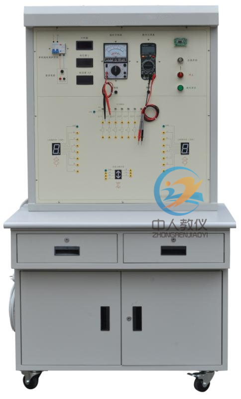 實訓(xùn)臺主體部分采用全鋼結(jié)構(gòu),鋼板亞光噴塑,美觀耐用,臺面采用鋁塑板印制而成,整個實訓(xùn)臺由漏電保護(hù)開關(guān)、熔斷器、開關(guān)電源、數(shù)顯計時器、智能刷卡啟動電路板、七段數(shù)碼管(共陰)、七段數(shù)碼管(共陽)、方向數(shù)碼管、交流接觸器、數(shù)字電壓表、數(shù)字電流表、指針萬用表、數(shù)字萬用表、照明日光燈、帶鎖開關(guān)、按鈕開關(guān)、鈕子開關(guān)、電阻器和安全接線柱等組成。