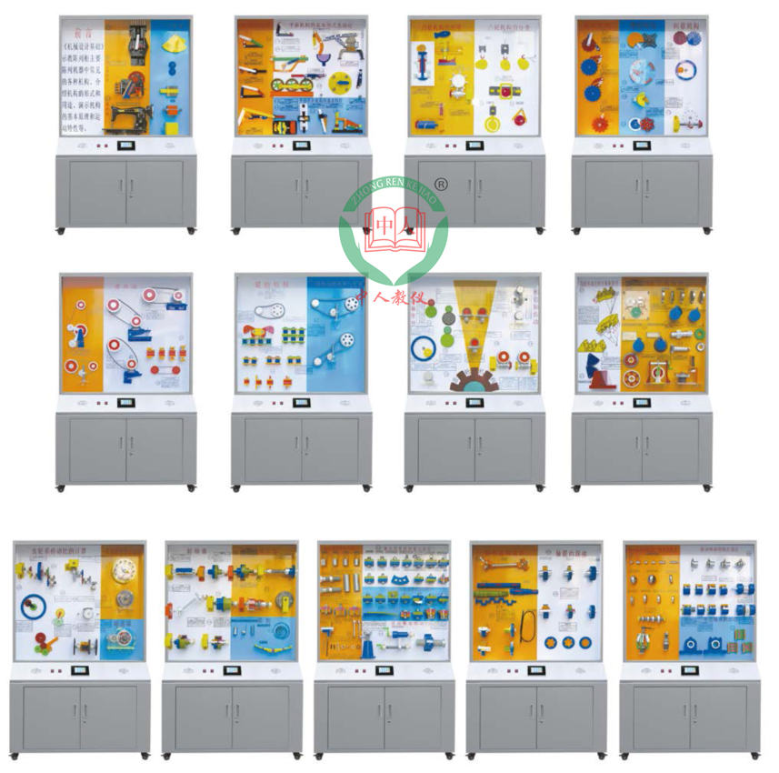 《機械設(shè)計基礎(chǔ)》示教陳列柜是根據(jù)教育部高職高專規(guī)劃教材設(shè)計的電化教學(xué)設(shè)備。本陳列柜共分十三個柜,具有多功能語音播放控制系統(tǒng)。柜體采用SPCC冷扎板焊成,堅固美觀可靠,柜內(nèi)模型材料采用進口有機玻璃和硬聚氯制作,板面附有PVC一次成型作必要的圖表和文字說明,演示形象逼真,運行可靠,制作工藝美觀,使用本陳列柜可提高教學(xué)效果,是一套現(xiàn)代化機械課程教學(xué)實驗室設(shè)備。