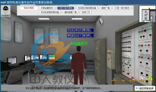 教學(xué)系統(tǒng)在構(gòu)建的虛擬的車站中,提供車站站長(zhǎng)、值班員、站務(wù)員、票務(wù)員、設(shè)備員等崗位的非正常情況下的應(yīng)急處置教學(xué)功能。