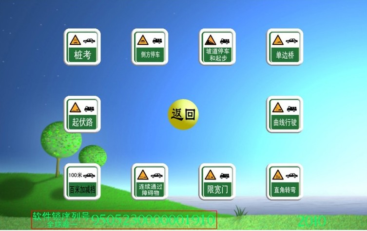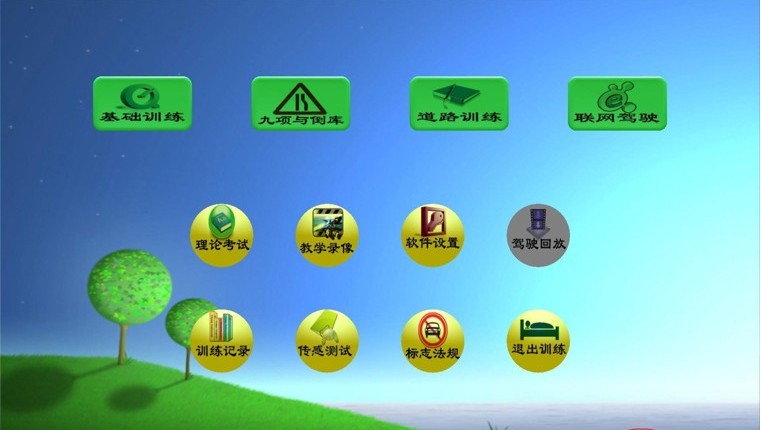 軟件主界面下圖所示,界面上有"基礎(chǔ)訓(xùn)練"、"九項與倒庫"、"道路訓(xùn)練"、"聯(lián)網(wǎng)駕駛"、"理論考試"、"教學(xué)錄像"、"軟件設(shè)置"、"駕駛回放"、"訓(xùn)練記錄"、"傳感測試"、"標(biāo)志法規(guī)"、"退出訓(xùn)練"。