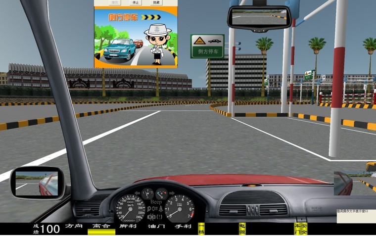 評判及提示語有:側(cè)方停車考試開始,側(cè)方停車考試結(jié)束,車輛在入庫后車身出線,碰擦樁桿,行駛中輪胎觸軋車道邊線,中途調(diào)整車身位置。