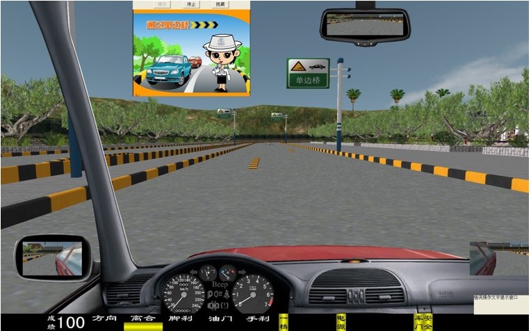 評判及提示語有:"通過單邊橋"考試開始,"通過單邊橋"考試結(jié)束,有一車輪未上橋,行駛中出現(xiàn)一個車輪掉下橋面,未通過單邊橋。