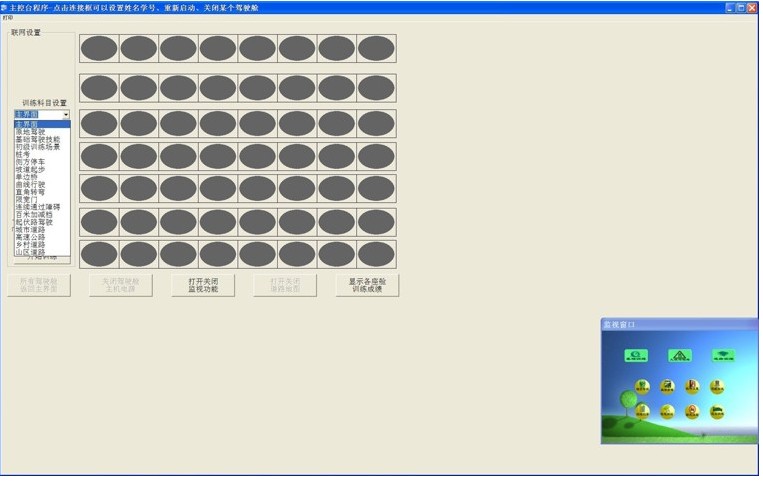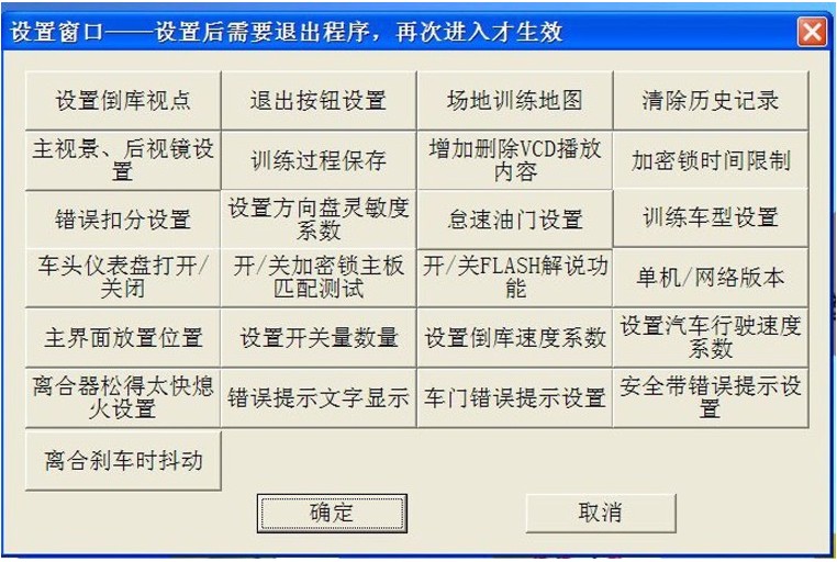 在設(shè)置界面,可以進(jìn)行設(shè)置的內(nèi)容有:"設(shè)置倒庫視點(diǎn)","退出按鈕設(shè)置","場地訓(xùn)練地圖","清除歷史記錄","主視景、后視鏡設(shè)置","訓(xùn)練過程保存","增加刪除VCD播放內(nèi)容","加密鎖時間限制","錯誤扣分設(shè)置","方向盤靈敏度系數(shù)","怠速油門設(shè)置","訓(xùn)練車型設(shè)置","車頭儀表盤打開/關(guān)閉","開/關(guān)加密鎖主板匹配測試","開/關(guān)FLASH解說功能","單機(jī)/網(wǎng)絡(luò)版本","主界面放置位置","設(shè)置開關(guān)量數(shù)量","設(shè)置倒庫速度系數(shù)","設(shè)置汽車行駛速度系數(shù)","離合器松得太快熄火設(shè)置","錯誤提示文字顯示","車門錯誤提示設(shè)置","安全帶錯誤提示設(shè)置","離合剎車時抖動"。