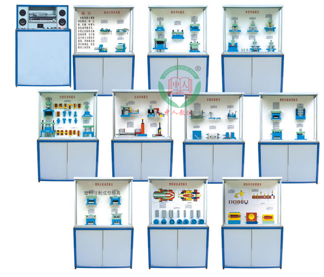 本公司力求實用根據(jù)學(xué)校教學(xué)要求需要、特制一套《冷沖壓與塑料成型工藝及模具設(shè)計》與《塑料成型模具》等教材設(shè)計而成的模具示教陳列柜,這套陳列柜共分十個柜, 具有多功能語音播放控制系統(tǒng)。