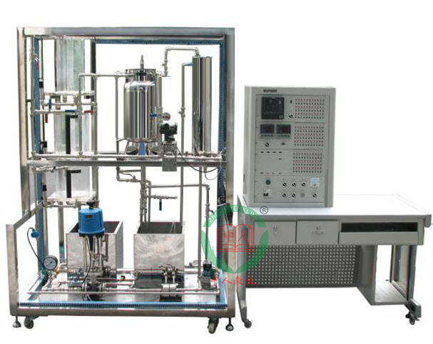 該實訓裝置包括一組有機玻璃三容水箱,每個水箱裝有液位傳感器;同時具有兩路供水系統(tǒng),一路由循環(huán)水泵、調(diào)節(jié)閥、孔板流量計+EJA的差壓變送器組成,另一路由變頻器、循環(huán)水泵、渦輪流量計組成,通過閥門切換,任何一組供水可以到達任何一個水箱。另外,為實現(xiàn)溫度控制,該實驗裝置專門設(shè)計了一只常壓電加熱鍋爐、一只強制對流換熱器。常壓電加熱鍋爐分內(nèi)膽和夾套兩層,內(nèi)膽由電加熱器提供熱源,由一路供水系統(tǒng)提供水源,鍋爐內(nèi)膽裝有防干燒裝置來確保設(shè)備安全;夾套由一路供水系統(tǒng)提供冷卻水。通過改變電加熱器的加熱功率或冷卻水/待加熱水的流量來影響內(nèi)膽水溫和夾套水溫。鍋爐內(nèi)膽和夾套均安裝有熱電阻測溫元件,在內(nèi)膽里面,還裝有一個就地溫度顯示儀表。
