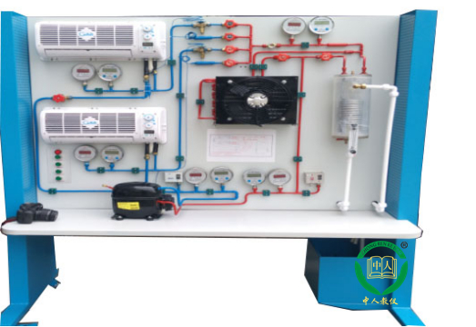 壓縮機、冷凝器、蒸發(fā)器、節(jié)流閥構(gòu)成制冷系統(tǒng),蒸發(fā)器、冷凝器均為水冷式,制冷系統(tǒng)工況通過加熱器調(diào)節(jié)蒸發(fā)器進出水水溫,通過閥門調(diào)節(jié)進出蒸發(fā)器、冷凝器水的流量來調(diào)節(jié);制冷量為蒸發(fā)器進出水帶走的熱量,通過測量冷凝器進出水帶走的熱量來校核實驗。模擬制冷系統(tǒng)故障現(xiàn)象和數(shù)據(jù)變化,實驗數(shù)據(jù)通過5寸彩色溫度/壓力監(jiān)控儀,實時顯示運行狀態(tài),實驗數(shù)據(jù)保存和打印功能。